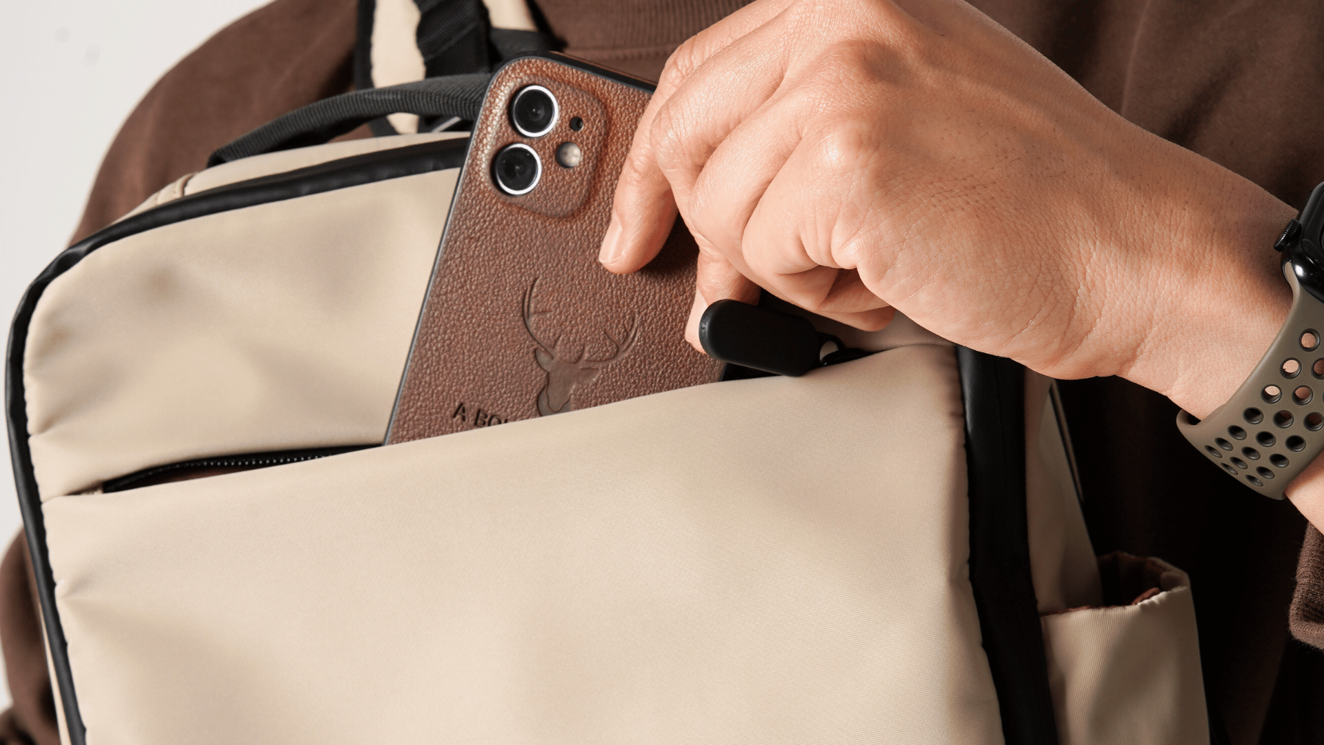 Multiple dedicated compartments for toiletries and clothes with touchscreen-sensitive compartment for phone usage.